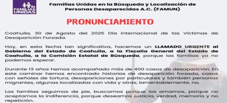 La FAMUN exige al Gobierno de Coahuila y a la Comisión de Búsqueda acciones inmediatas ante crisis de desapariciones