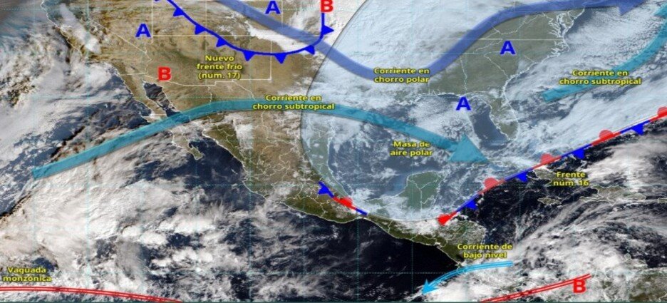 Una circulación anticiclónica en niveles medios de la atmósfera favorecerá tiempo estable y sin lluvia sobre el resto de la República Mexicana; manteniéndose ambiente frío a muy frío, con heladas al amanecer y bancos de niebla matutinas sobre entidades de la Mesa del Norte y la Mesa Central.