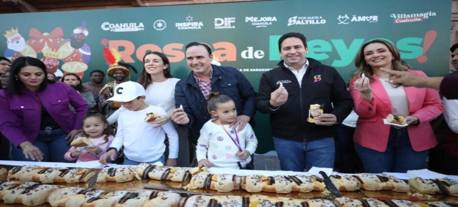 Manolo Jiménez Salinas y su esposa, Paola Rodríguez, encabezaron la tradicional partida de la rosca de reyes ante los saltillenses, donde la Universidad Vizcaya de las Américas contribuyó con una mega rosca de un kilómetro de longitud.